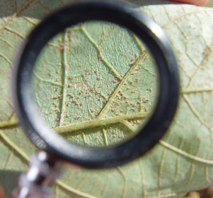 Soybean rust pustules under a 20X magnification.
