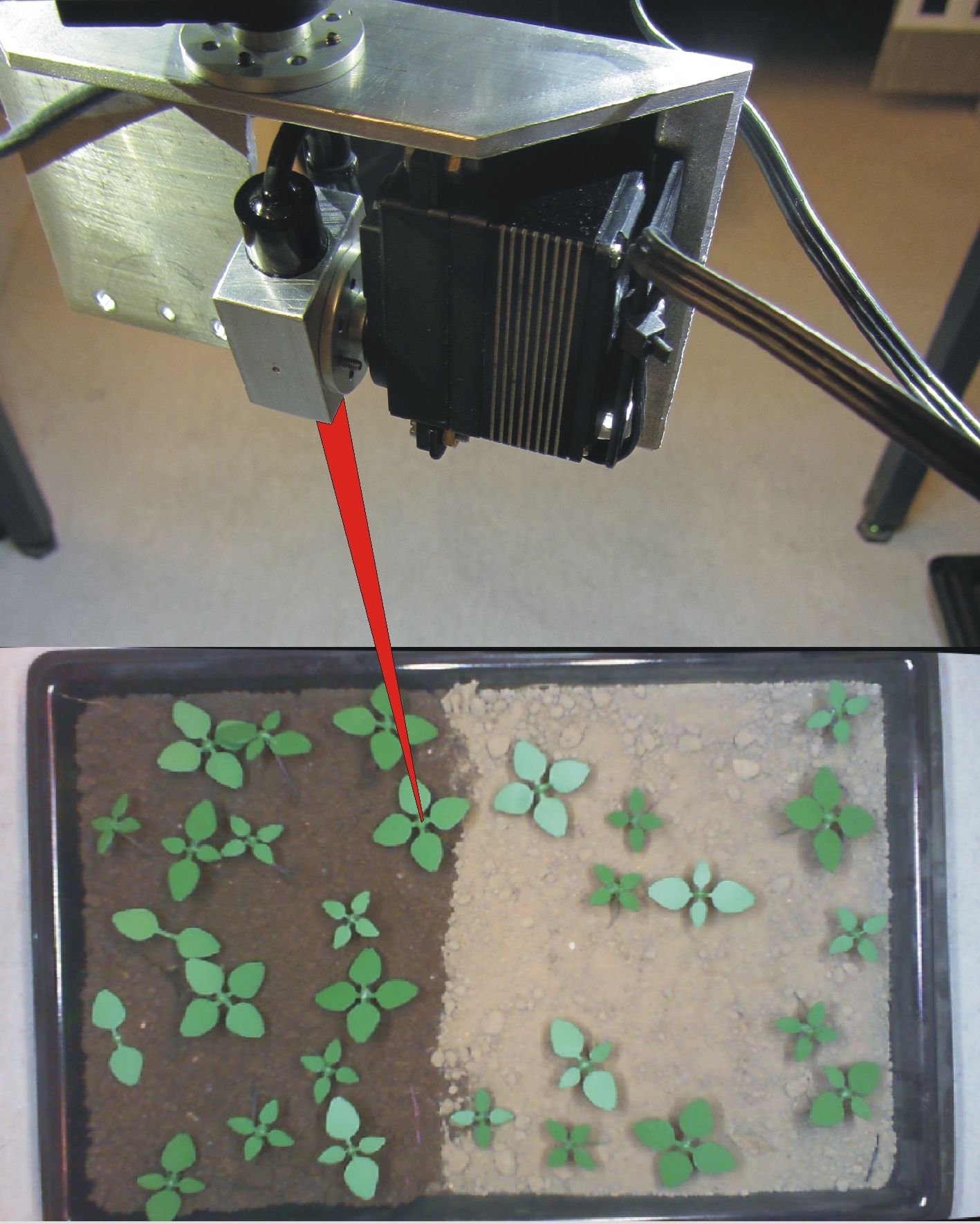 Exact positioning of the laser beam (highlighted in red for illustration) on weed model plants in a laboratory test stand