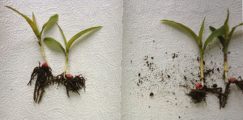 Links die mit aqua.seed behandelte agaSAAT Sorte DYNAMITE, rechts die Kontrollpflanzen: Die aqua.seed-Pflanzen verfügen über eine größere Wurzelmasse (Aussaat: 25. April, Probeentnahme: 17. Mai, Standort: Bocholt)