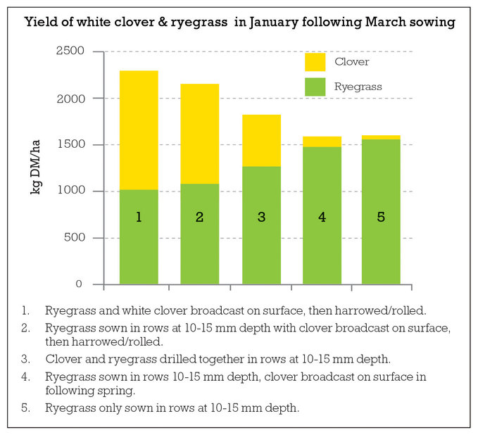 Nine months after sowing, broadcasting ryegrass and clover (similar to roller drilling) or drilling the ryegrass and broadcasting the clover, resulted in over 20% more clover in the sward than sowing ryegrass and clover in the same drill row.