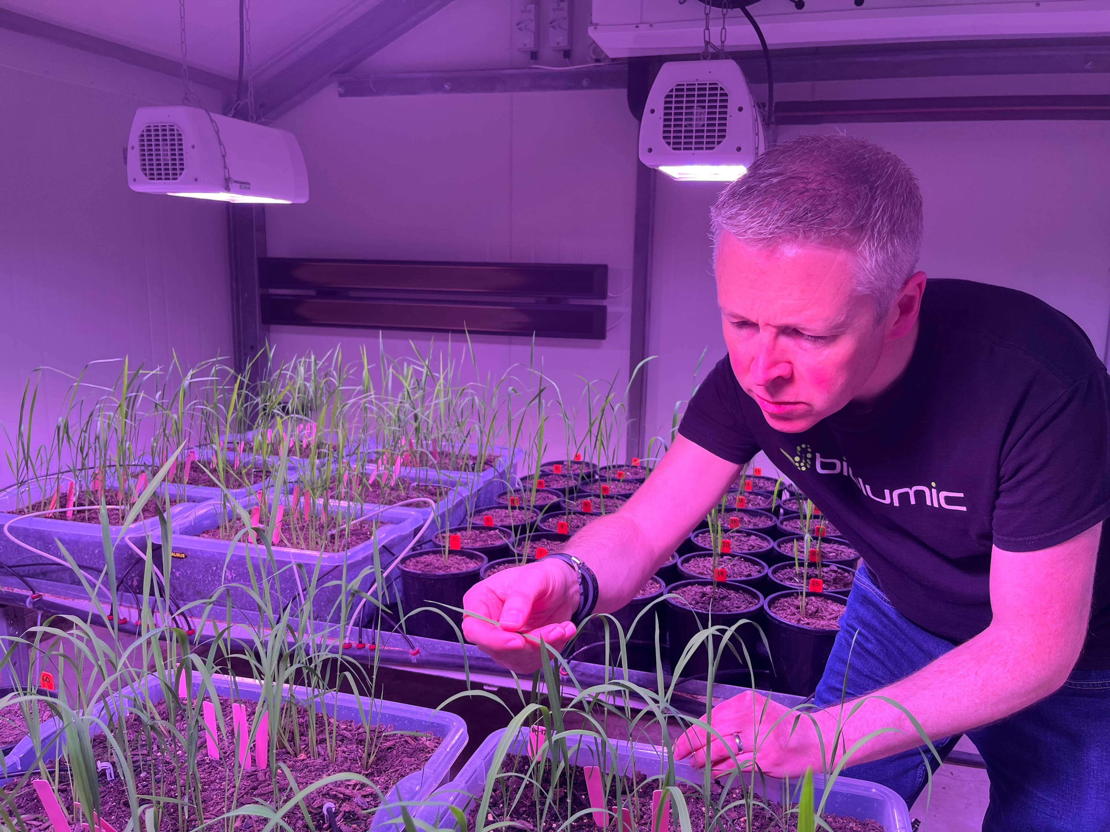 Dr. Jason Wargent, BioLumic founder and Chief Science Officer, observing rice seedlings under UV light